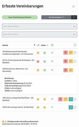 Die Maske Erfasste Vereinbarungen dient der Übersicht und der Synchronisation der angelegten PW1-Vereinbarungen auf dem Tablet.