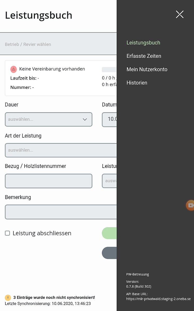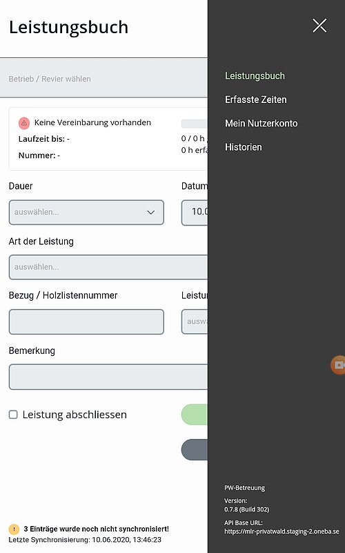 Nach der Anmeldung und Revierauswahl gelangen sie hierüber in die Maske Leistungsbuch oder die Liste der erfassten Zeiten.