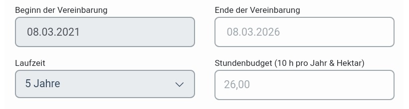 4. Der Beginn der Vereinbarung wird auf das aktuelle Datum voreingestellt und anhand der voreingestellten Laufzeit von 5 Jahren das Ende sowie das maximale Stundenbudget der Vereinbarung berechnet: