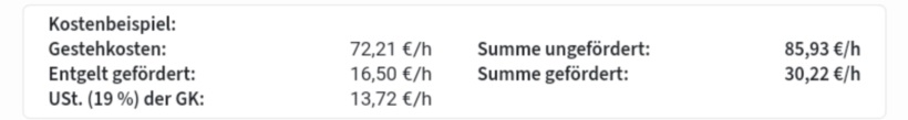 6. Das Kostenbeispiel dient der Erklärung der Kosten, die pro Stunde im Falle einer Förderung oder ohne Förderung zu zahlen sind.