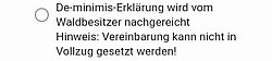 7.3. Waldbesitzer erklärt, dass der Betrieb im aktuellen und den letzten zwei Steuerjahren De-minimis-Förderungen erhalten hat. Da er/sie die Daten aber nicht dabei hat, werden diese in schriftlicher Form als De-minimis-Erklärung nachgereicht.