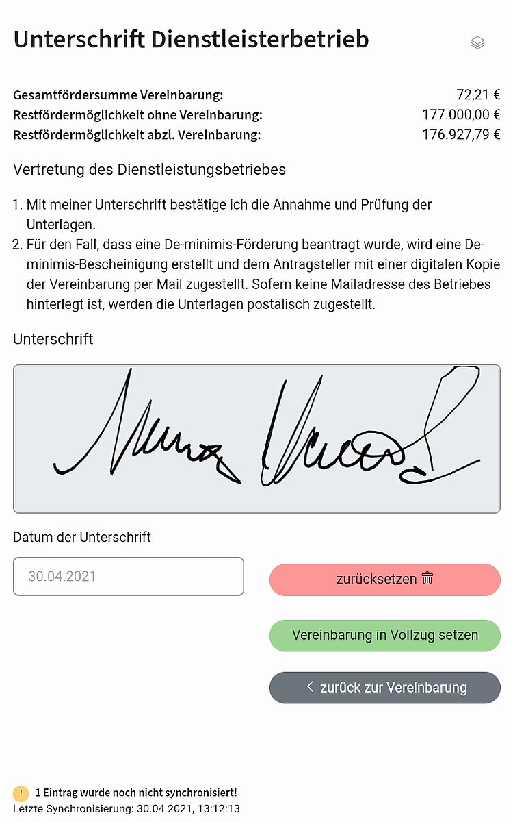 Mit der Schaltfläche "Unterschrift speichern" wird die Unterschrift und das Unterschriftsdatum gespeichert und es erscheint die Meldung "Wollen Sie die Vereinbarung wirklich "in Vollzug" setzen", die entsprechend bestätigt oder abgebrochen werden muss.