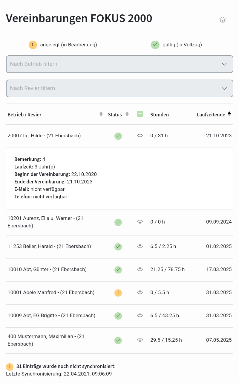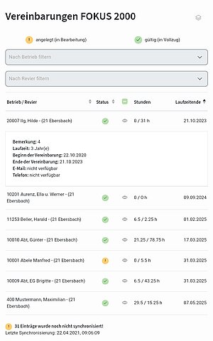Die Vereinbarungen werden hier - im Gegensatz zur Maske Leistungsbuch - mit mehr Details angezeigt.