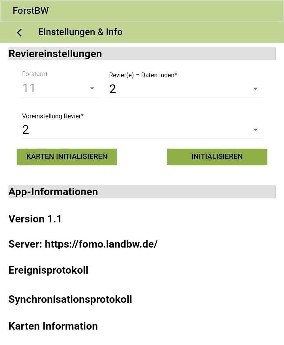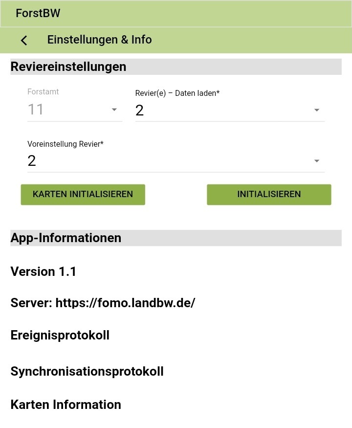 - Reviereinstellungen: Bevor Sie die App vollumfänglich nutzen können müssen Sie Forstamt und Revier einstellen.