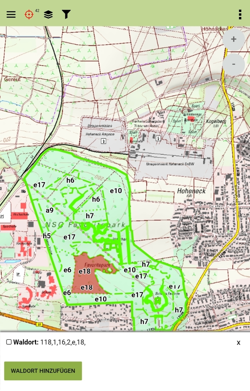 Das Kartenthema "Waldorte" ist sichtbar und selektierbar geschaltet. Wenn Sie einen Waldort selektieren können Sie diesen über die Schaltfläche im Informationsfenster der Aufnahme hinzufügen.