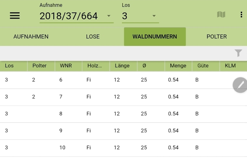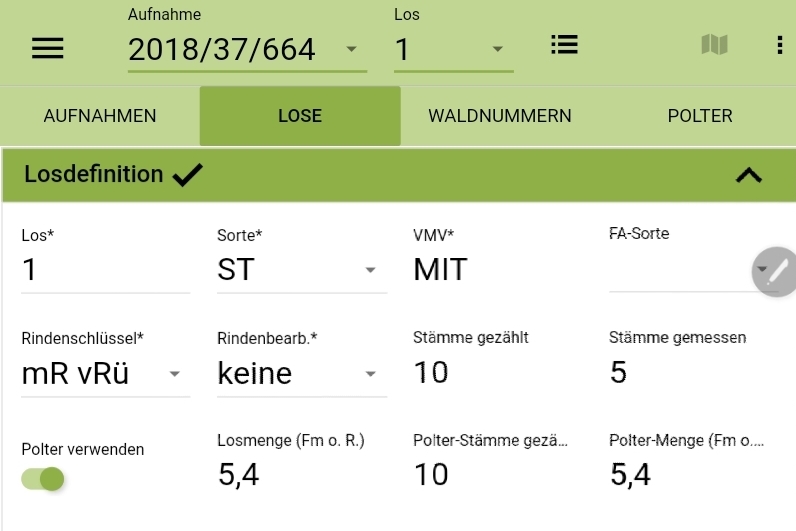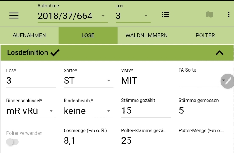 Die Losmenge wird automatisch berechnet. Sie dient als Verkaufsmaß und wird unabhängig von der Poltermenge berechnet. Die Poltermenge dient lediglich als Größenordnung für die Holzabfuhr.