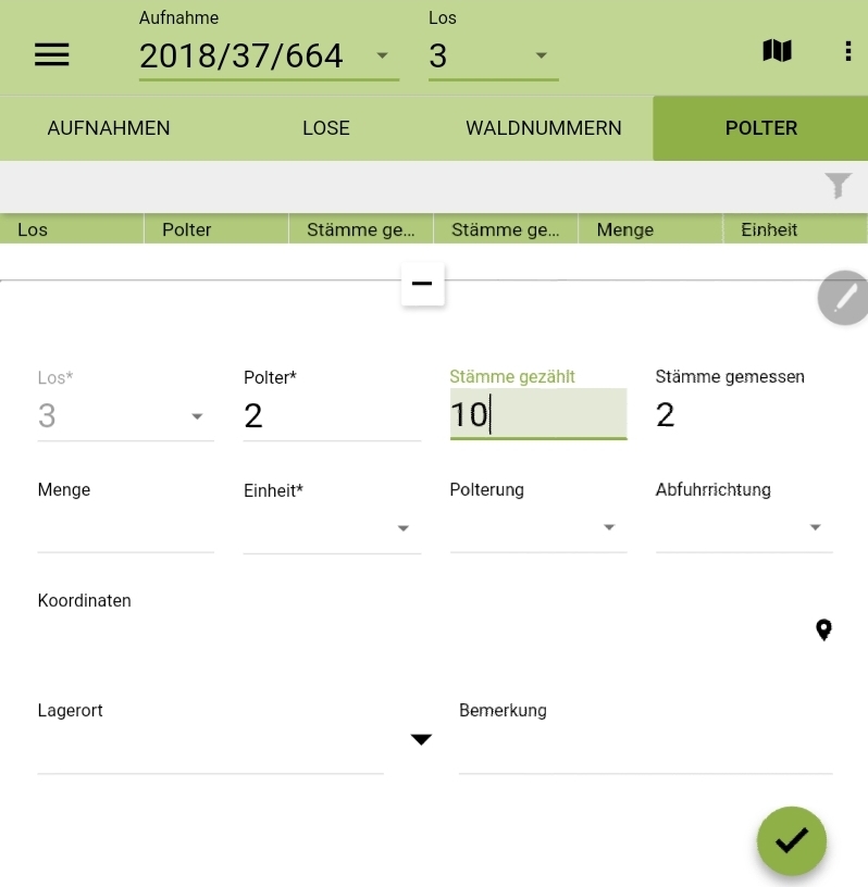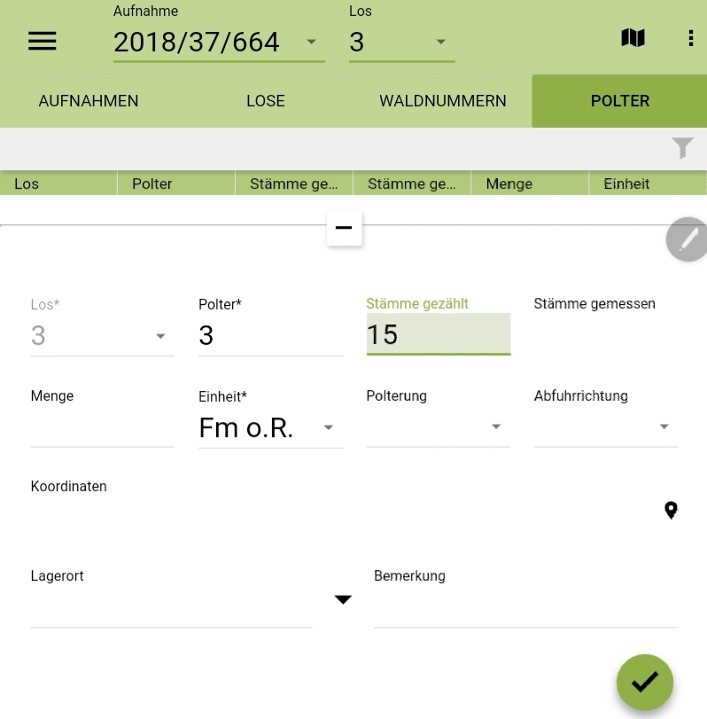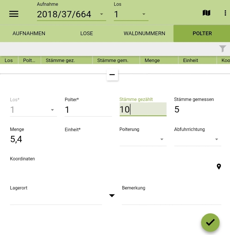 - "Stämme gezählt" > "Stämme gemessen": Stichprobe; Eingabe der Stammanzahl erfolgt in der Maske Polter; Die Menge wird hochgerechnet.