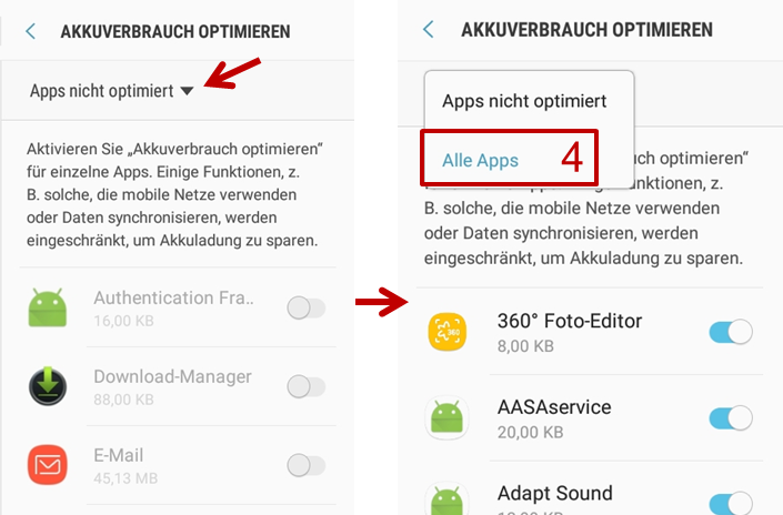 - Es können einzelne Apps manuell wieder aus der Optimierung herausgenommen werden (Schalter = blau => App wird optimiert)