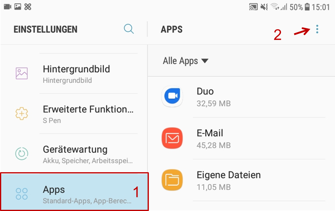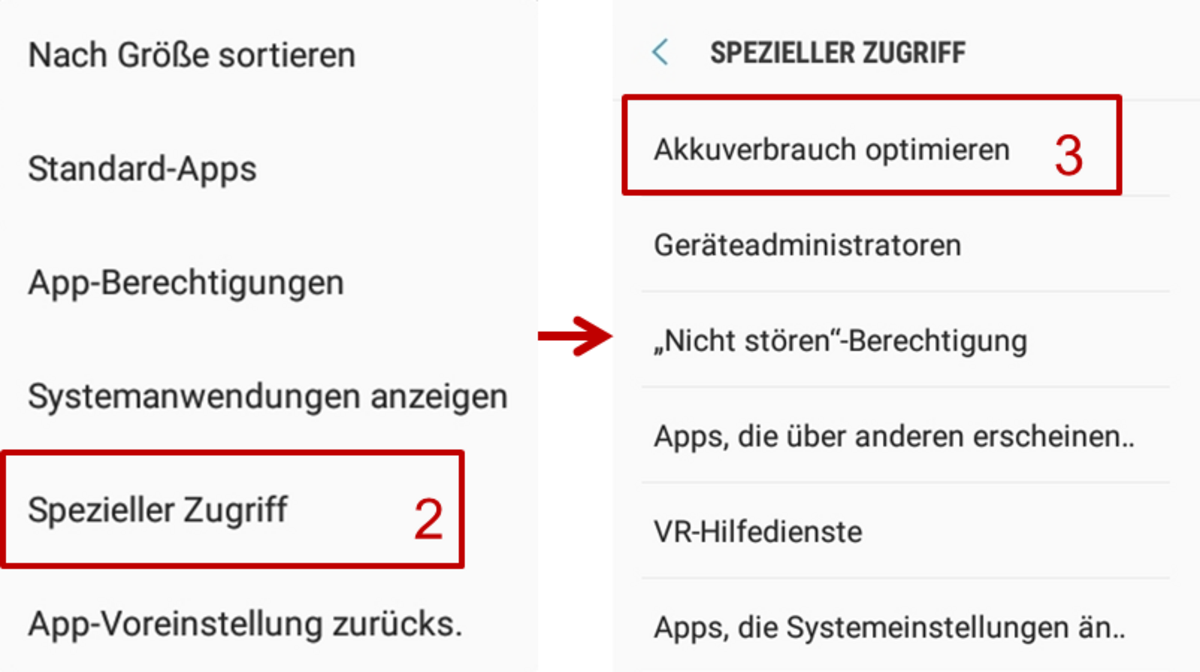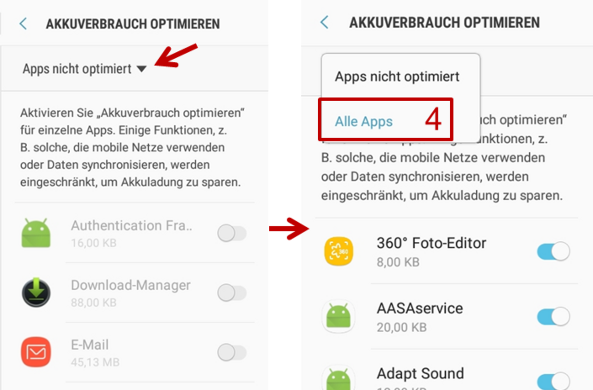 - Sie können durch die Funktion Akkuverbauch optimieren den Stromverbrauch von Apps reduzieren (siehe Anleitung unten)